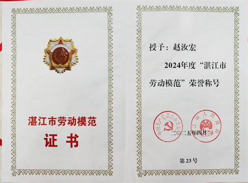4月27日,湛江市委、市政府召開2025年湛江市慶祝“五一”國際勞動節大會,為進一步弘揚勞模精神、勞動精神、工匠精神,為湛江跨越式、高質量發展廣泛匯聚智慧和力量,根據《中共湛江市委湛江市人民政府關于表彰湛江市勞動模范、先進工作者和先進集體的決定》,會上表彰湛江市勞動模范、先進工作者和先進集體。其中,我司趙汝宏同志榮獲湛江市勞動模范稱號。